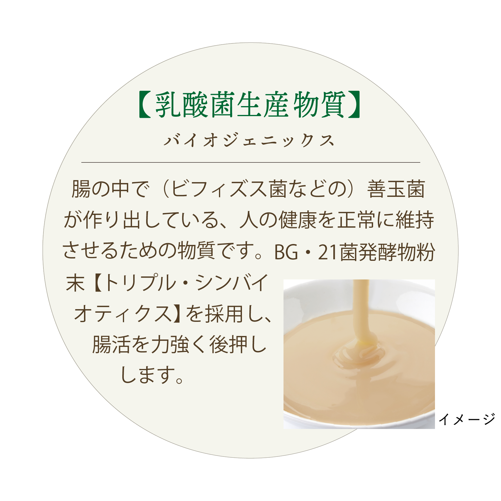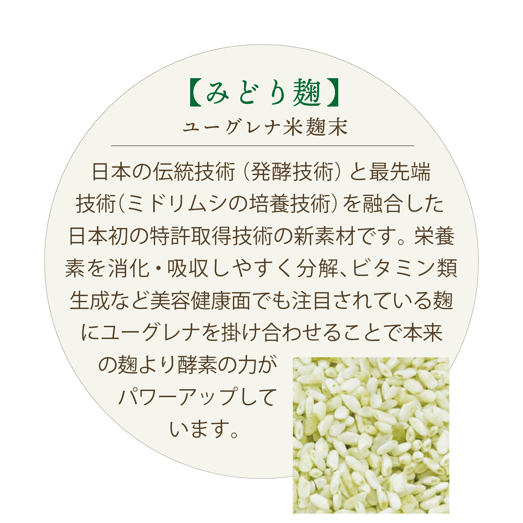 麹菌にユーグレナを入れ発酵パワーをアップさせた『みどり麹』、体内の乳酸菌をサポートする『乳酸菌生産物質』を配合した、