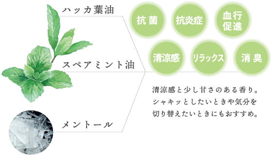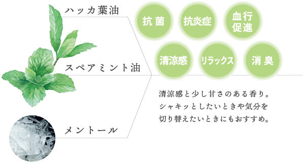 - ※成分そのものに期待される効果です。アイスミントエッセンスの使用によって上記の効果が必ず発現するとは限りません。